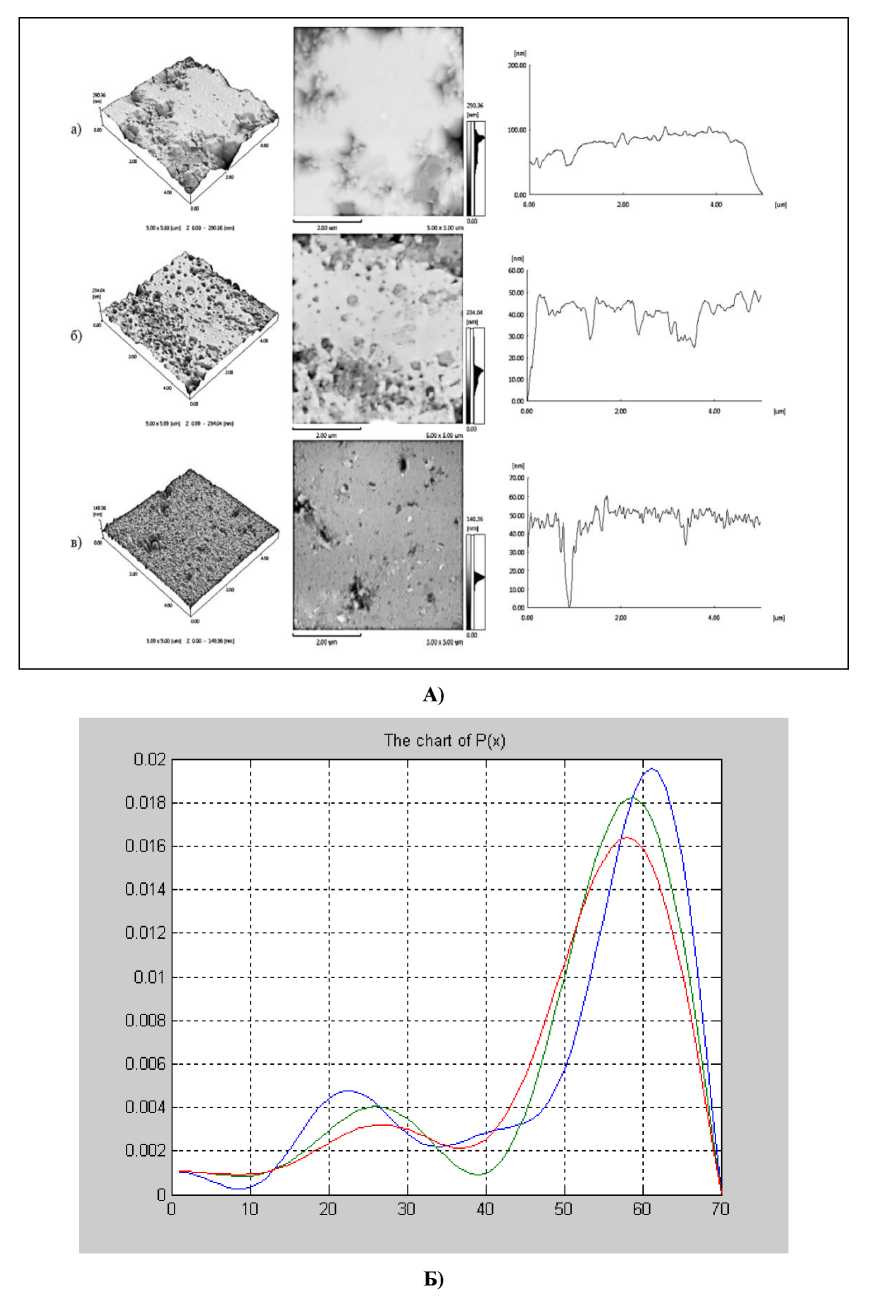 2. Fig. 1. А) Atomic-force microscopy images of membrane topologies and depth profile graphs of membrane for low POSS concentrations (wt.%). Б) Pore depth distribution laws for the first three selected membrane sections