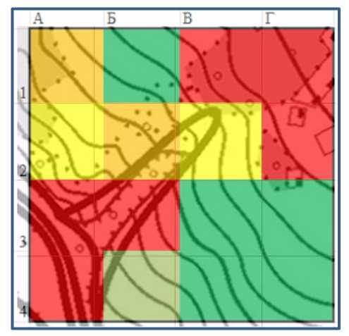 Для безопасного движения по бездорожью необходимы: полный анализ маршрута, разработка наиболее безопасных, предсказуемых маршрутов; отслеживание метеорологических условий. Один из методов обеспечения безопасности – построение карт подвижности [9-12], один из примеров которых представлен на рис. 6. Распределение по областям следующее: Б1, В3, Г3, Б4, В4, Г4 – движение возможно с максимальной скоростью; А2, В2 – скорость составляет 50-75 % от максимально возможной; А1, Б2 – скорость составляет от 25 до 50 %; В1, Г1, Г2, А3, Б3, А4 – скорость составит до 25 % от максимально возможной, встречаются непроходимые препятствия, возможна полная потеря подвижности. Улучшить данные показатели может привлечение более опытного водителя, который может использовать особенности рельефа для повышения проходимости. Повысить проходимость автомобиля способны также дополнительные устройства и оборудование: лебедка, грунтозацепы различной конфигурации, уширители, устройства для снижения или повышения давления в шинах для лучшей адаптации к материалу полотна пути.