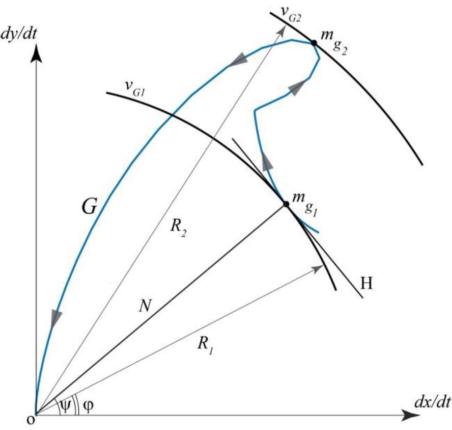 Fig. 3. Phase velocity hodograph. At the part of trajectory mg1mg2 representative point has accelerated motion (the point is in the A). Radius-vectors Ri, traced to the mgi, are in the common line and it have own normal N
