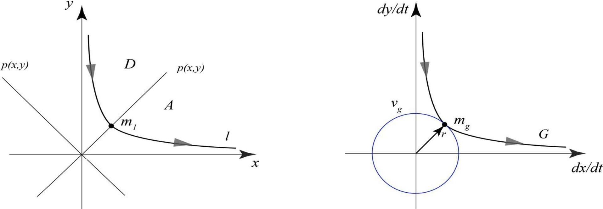 Интуитивно понятно, что граница между ускоренным и замедленным движением (P на рис. 1) соответствует равномерному движению, т.е., если ξ=±π2, то wτ=0 (рис. 2с). Фактически граница P или условие ξ=±π2 определяет на фазовой плоскости геометрическое место критических точек, в которых dvdt=0 и, одновременно, v0. Если при каких-либо начальных условиях lP, то найдутся точки ( m1 и m2, рис. 1), которые могут являться экстремумом фазовой скорости на l=Fx,y (такой экстремум в математическом анализе называется условным или относительным [4]), т.е. сформируется множество M=m1,m2. Рассмотрим выполнение необходимых и достаточных условий существования условного экстремума в точках m1 и m2 (рис. 1). Для этого будем использовать усовершенствованный метод фазовой плоскости [5], суть которого заключается в построении годографа фазовой скорости G=F^dxdt,dydt в декартовой системе координат dxdtOdydt (рис. 3) и поиска точек касания изолиний фазовой скорости и G. Годограф фазовой скорости ‒ кривая G, вычерченная концом радиус-вектора R:
