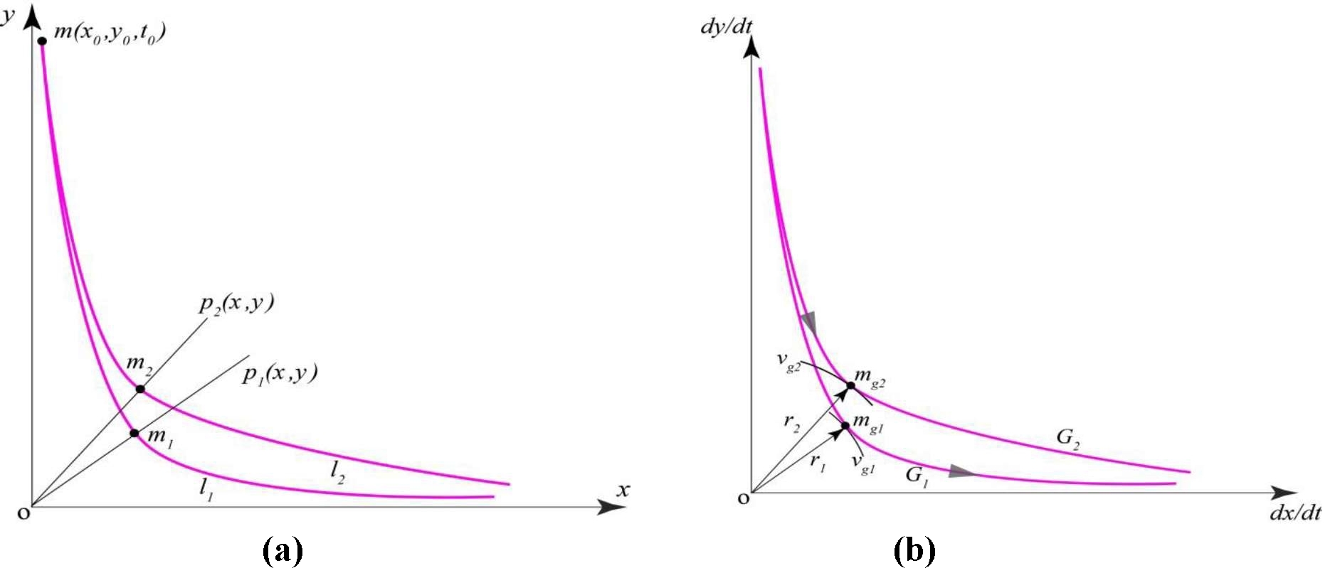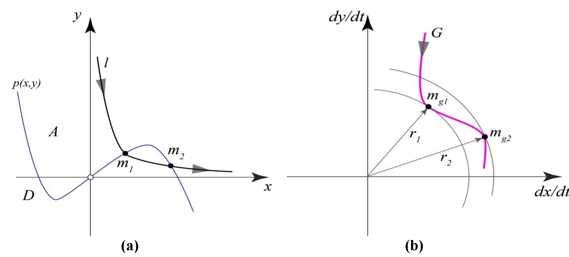Годограф фазовой скорости G получается путем непрерывного отображения l на плоскость dxdtOdtdt. Также верно, что существует непрерывное отображение для множества V=vG1,...,v|Gk на плоскость xOy. Таким образом, если на G найдутся точки условного экстремума (общие для G и V), то эти точки будут отражены на l, т.е. существует непрерывное отображение f:M¯GM. Пары mi,RvGi , которые содержат координаты mi и ее скорости RvGi, могут быть использованы для описания изменения состояния динамической системы. Достаточность такого описания определяется тем, что пары mi,RvGi  на фазовой траектории образуют геометрическое место точек, фазовая скорость которых принимает экстремальные значения. Множество, сформированное парами mi,RvGi, задает закон изменения состояний вдоль траектории.