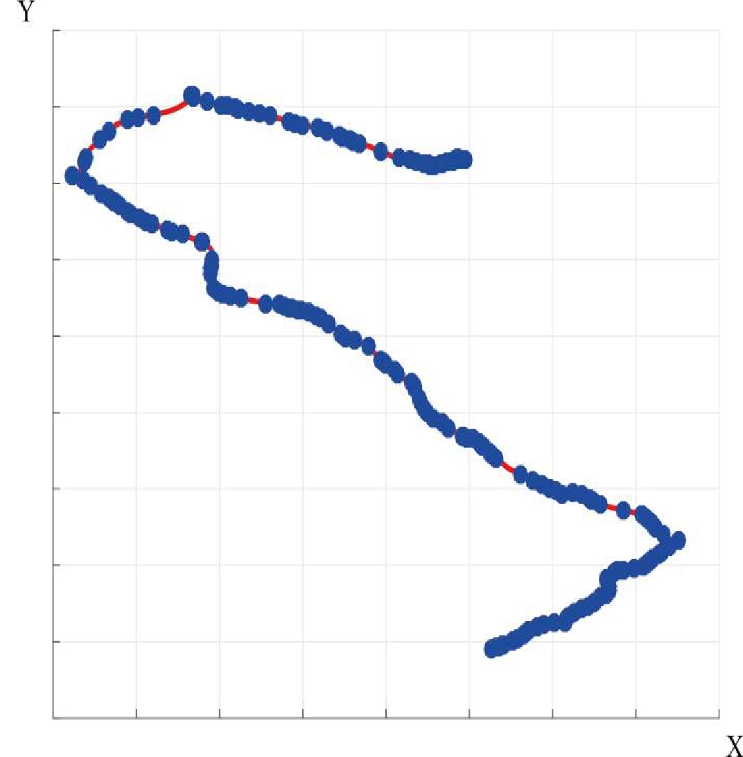 В данной работе мы подробно остановимся на решении первой задачи. Ранее было предложено описывать состояние динамической системы парой mi,RvGi или mgi,RvGi. Рассмотрим движение в транспортном потоке (подобные задачи рассматриваются в теории массового обслуживания, теории игр и др. [9, 10]). Траектория движения – кривая на плоскости географических координат X-Y. Кривая строится по точкам, которые могут быть получены, например, по данным GPS-приемника. Для этого в процессе эксперимента использовался туристический навигатор GARMIN, который фиксировал путевые точки с постоянным шагом, равным 1 сек. После обработки массив точек был нанесен на плоскость X-Y (рис. 8).