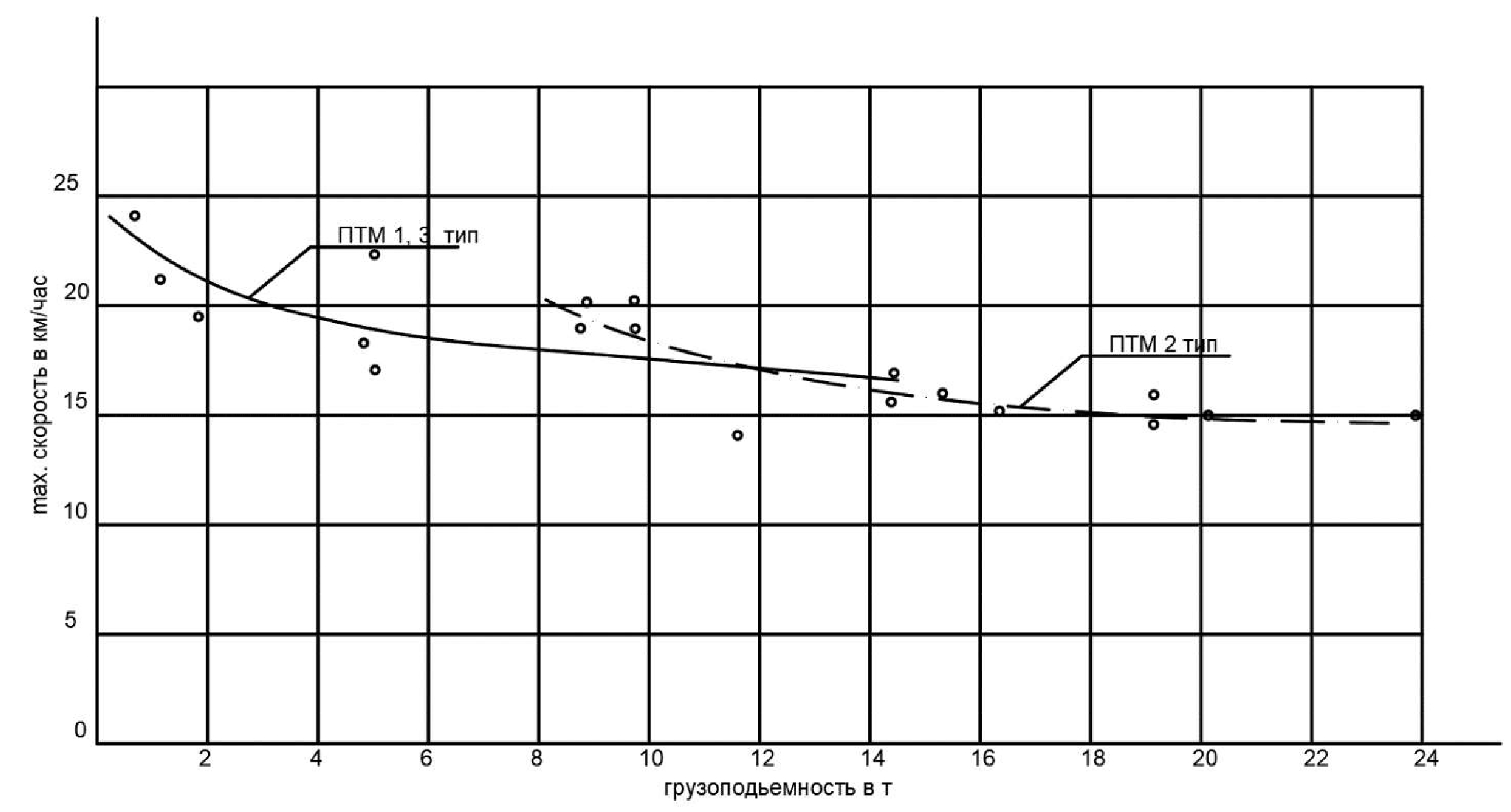 Выразим функциональную зависимость для указанных типов ПТМ графически (рис. 5), пользуясь данными максимальных скоростей движения, полученными при испытаниях [1, 4], а также исходя из технических характеристик ПТМ [5, 2, 15].