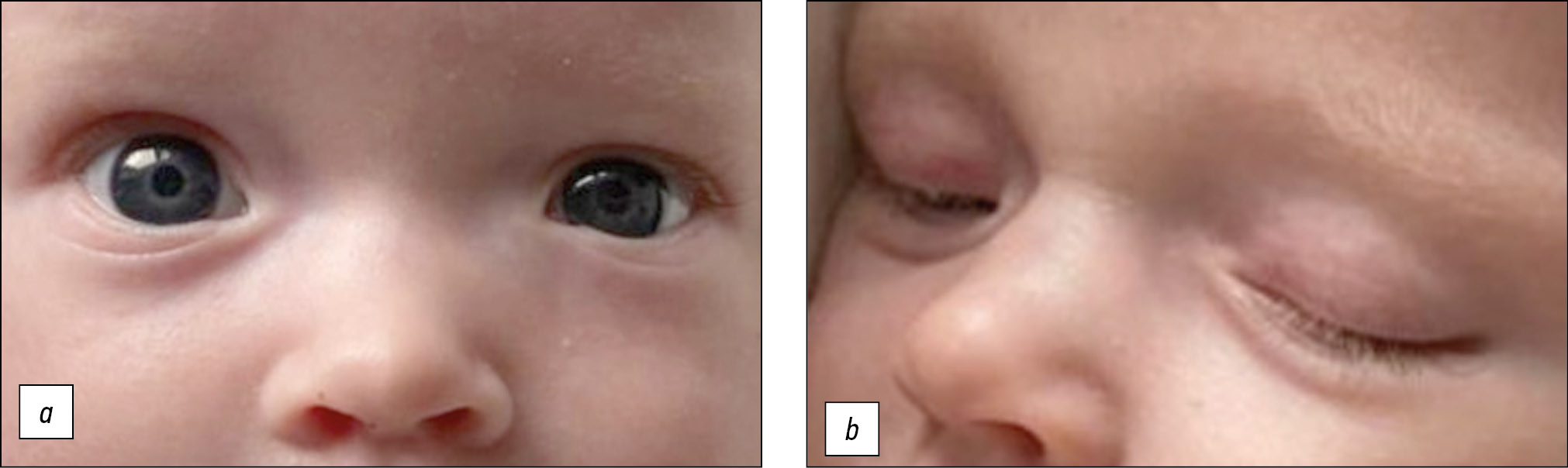 Рис. 5. Внешний вид области левого слёзного мешка после зондирования (а) и рецидив дакриоцистоцеле на 10-й день после процедуры (б). / Fig. 5. Appearance of the left lacrimal sac area after probing (a) and dacryocystocele recurrence on the 10th day after the procedure (b).