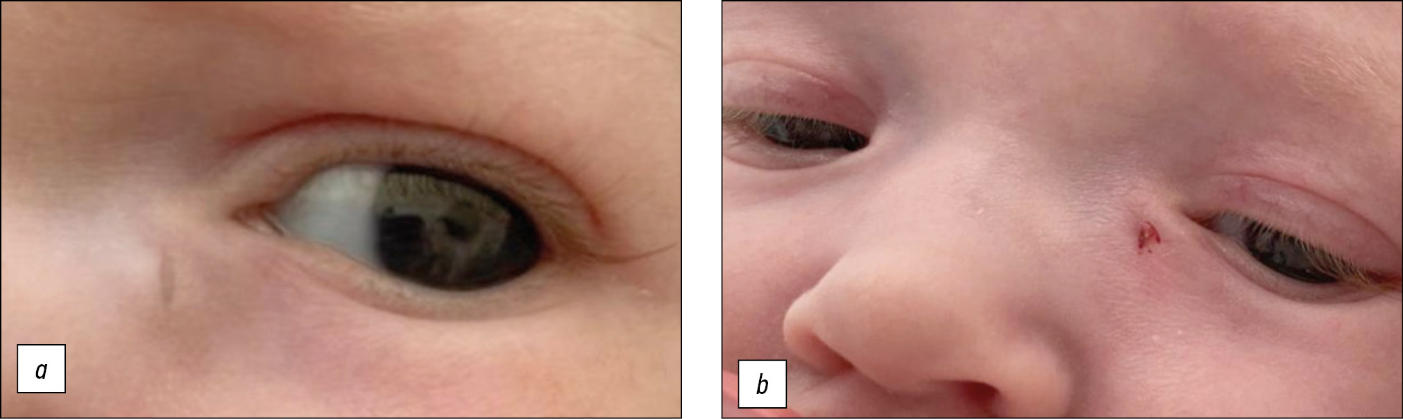 В двух детских офтальмологических стационарах в возрасте 1 месяца ребёнку дважды проведено зондирование слёзоотводящих путей слева с временным успехом в виде отсутствия образования (рис. 5, а), однако, через 10 дней симптомы вновь возобновились (рис. 5, б).