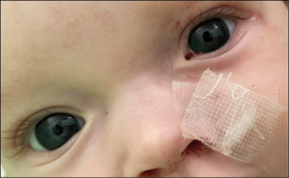 В двухмесячном возрасте ребёнку проведено оперативное вмешательство совместно с отоларингологами. Осуществлено: удаление назолакримальных кист с обеих сторон и реконструкция слёзоотводящих путей с их интубацией силиконовой нитью слева (рис. 9).