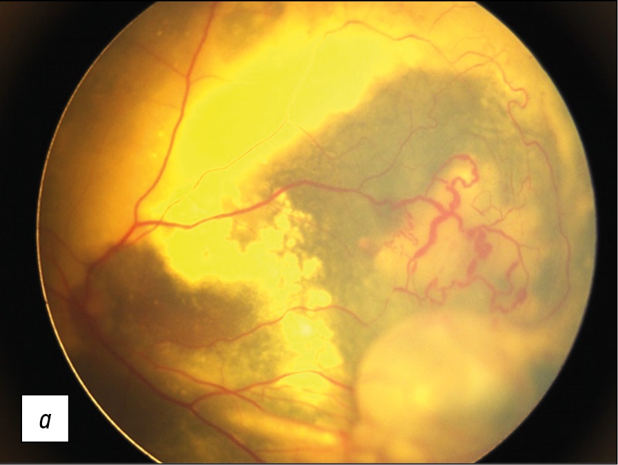 Рис. 1, а. Субтотальная отслойка сетчатки при болезни Коатса до лечения.