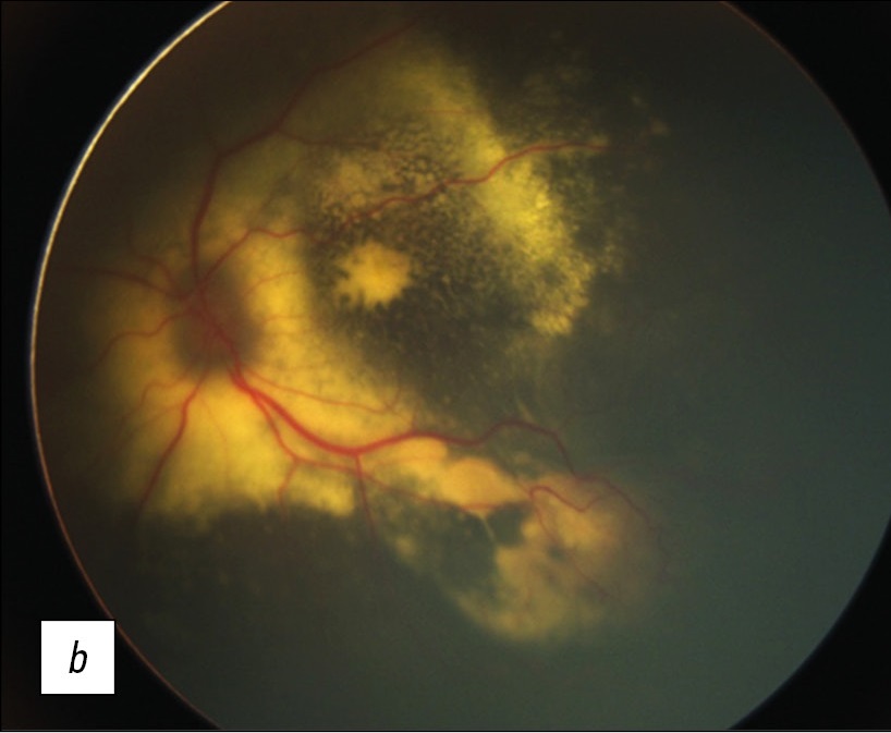 До проведения лазеркоагуляции высокая острота зрения (0,6– 1,0) отмечена только в случаях БК без изменений макулы. У 23 из 25 детей (92,0%) с сосудистыми и экссудативными изменениями в макуле без отслойки сетчатки, а также у 35 из 37 детей (94,6%) с локальной или распространённой отслойкой сетчатки острота зрения не превышала 0,1. Причиной такой низкой остроты зрения являются объёмные отложения интра- и субретинального экссудата, наличие округлого экссудативно-фиброзного очага в макуле (рис. 2) или кистозного макулярного отёка (рис. 3).