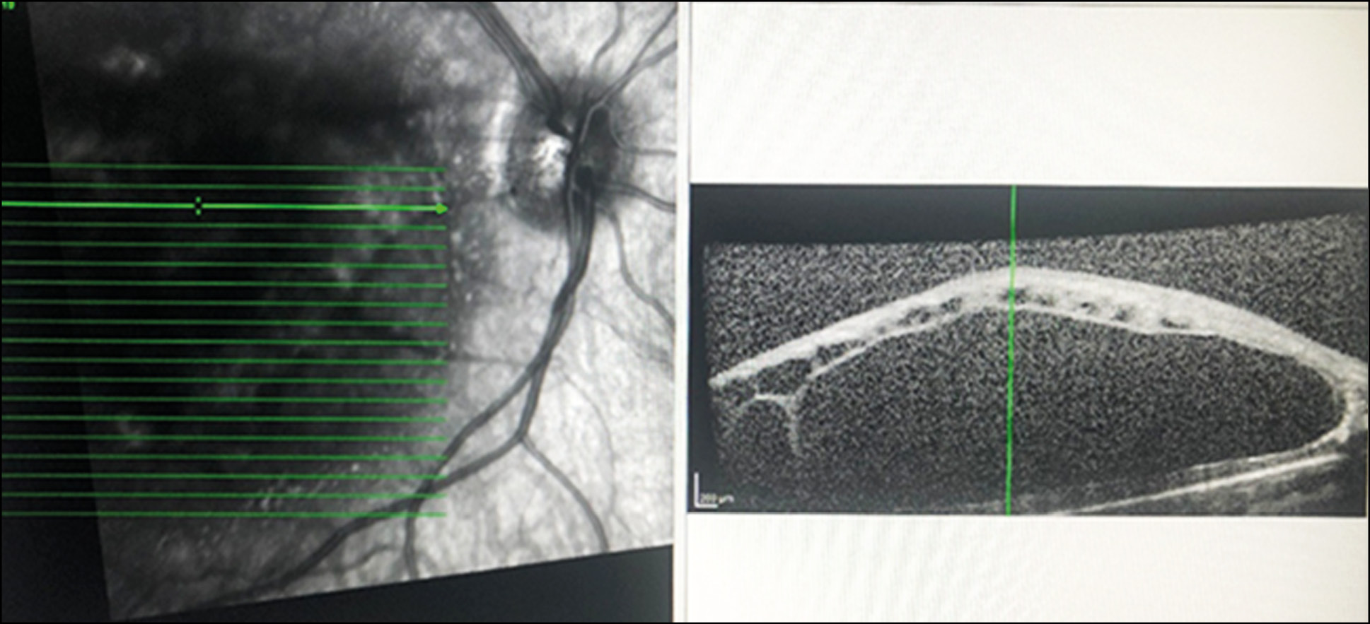 Рис. 3. Кистозный макулярный отёк у ребёнка с болезнью Коатса.