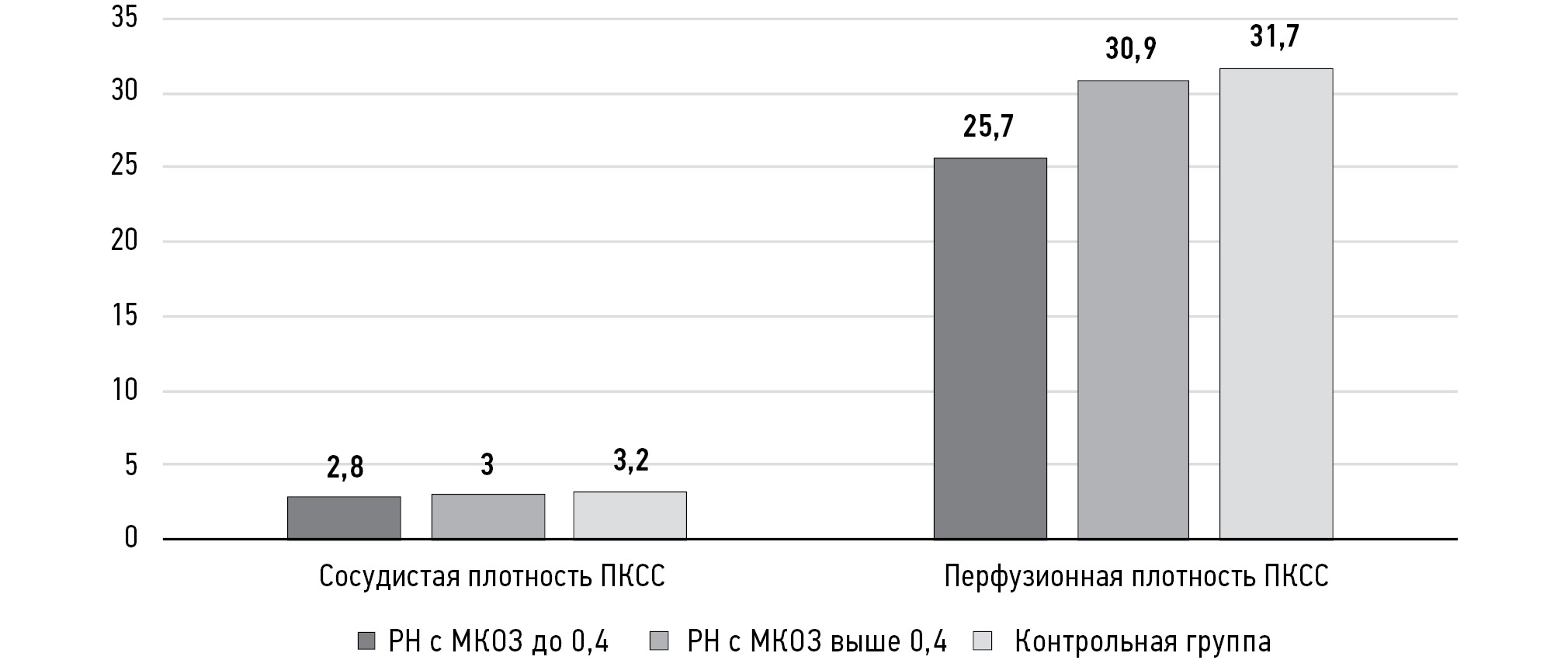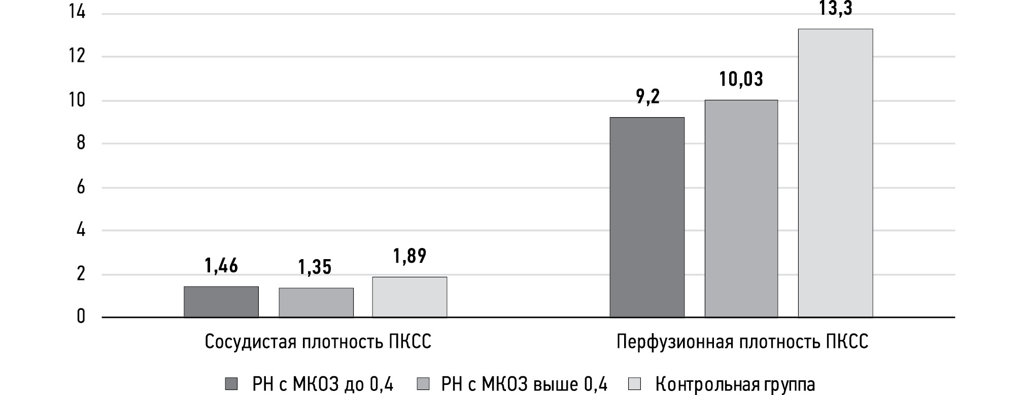 Сосудистая плотность ПКСС в группе детей с РН в среднем составила 1,39±0,08 mm-1, а в контрольной группе — 1,89±0,08 mm-1 (p >0,05). При этом, в подгруппе детей с РН с МКОЗ до 0,4 данный показатель составил 1,46±0,2 mm-1, а выше 0,4 — 1,35±0,07 mm-1 (p >0,05) (рис. 2).