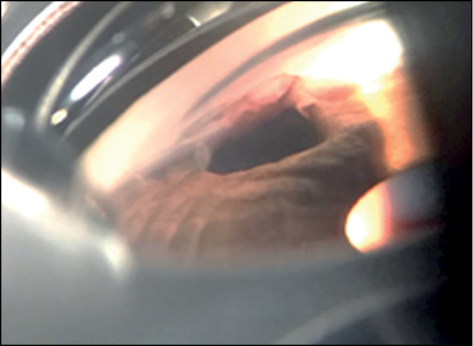 В большинстве случаев блок ВФ гониоскопически был представлен в виде иридотрабекулярного контакта (т.н. «подлипания» радужки) (61,7%) или сращений разной плотности и протяженности (15,0%) (рис. 3), причём в 9,6% случаев сращения оказались плоскостными.