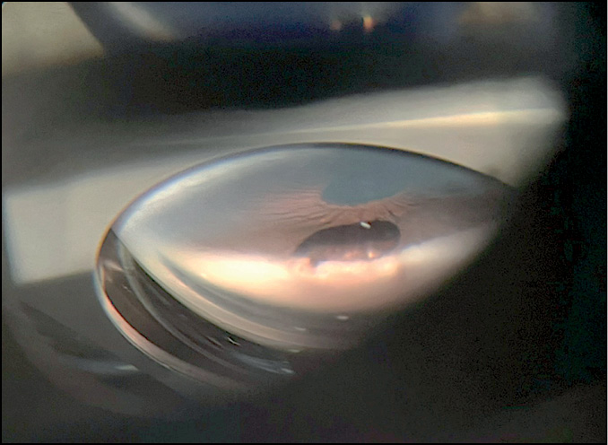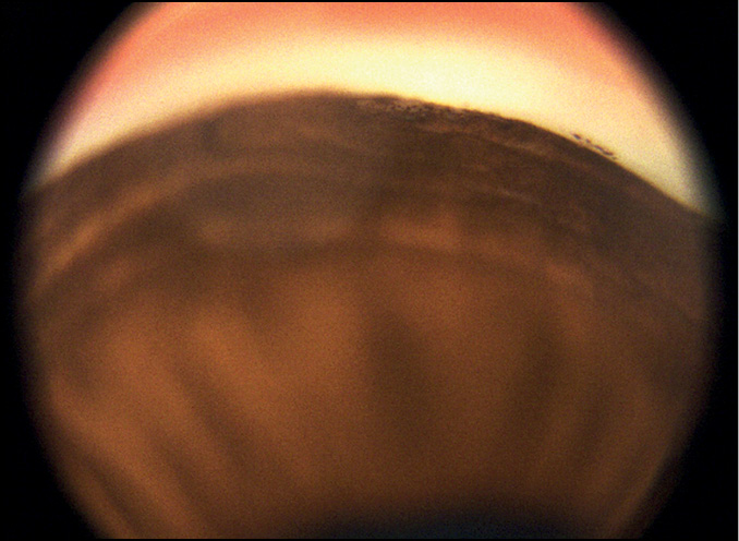 Особенно часто в пределах операционной колобомы радужки выявляли прогрессивное врастание пигментных наложений типа «язычков» от корня радужки в профиль ВФ (рис. 4), которые нередко постепенно облитерировали весь её просвет (13,7%). В редких случаях (4,1% глаз) сращения сочетались с фиброзными плёнками в просвете ВФ (рис. 5).