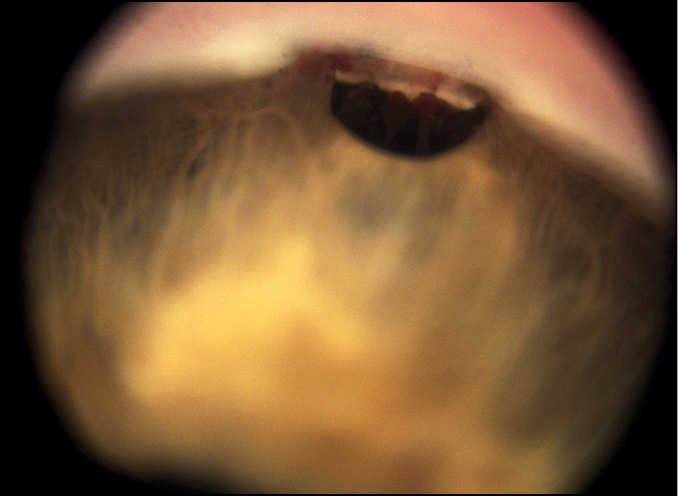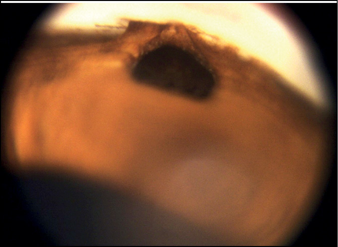 После ТЭ нередко у детей наблюдали врастание краев послеоперационной колобомы радужки в зону ВФ — по краям её (рис. 6), реже – почти полное заращение послеоперационной колобомы радужки и зоны внутренней фистулы (рис. 7).
