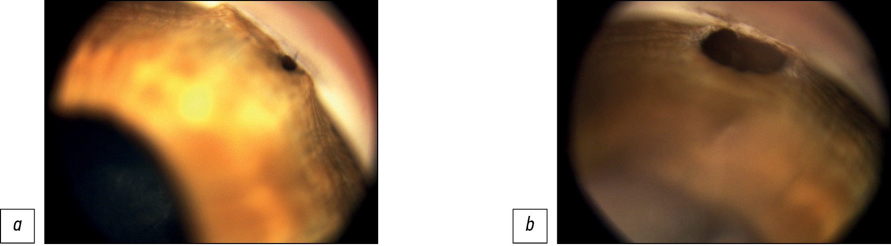 Рис. 7. Иридотрабекулярное сращение в зоне внутренней фистулы (полный блок с заращением послеоперационной колобомы радужки): а — до лазерной операции; b — после лазерной операции внутренней фистулы и колобома радужки свободны от сращений.