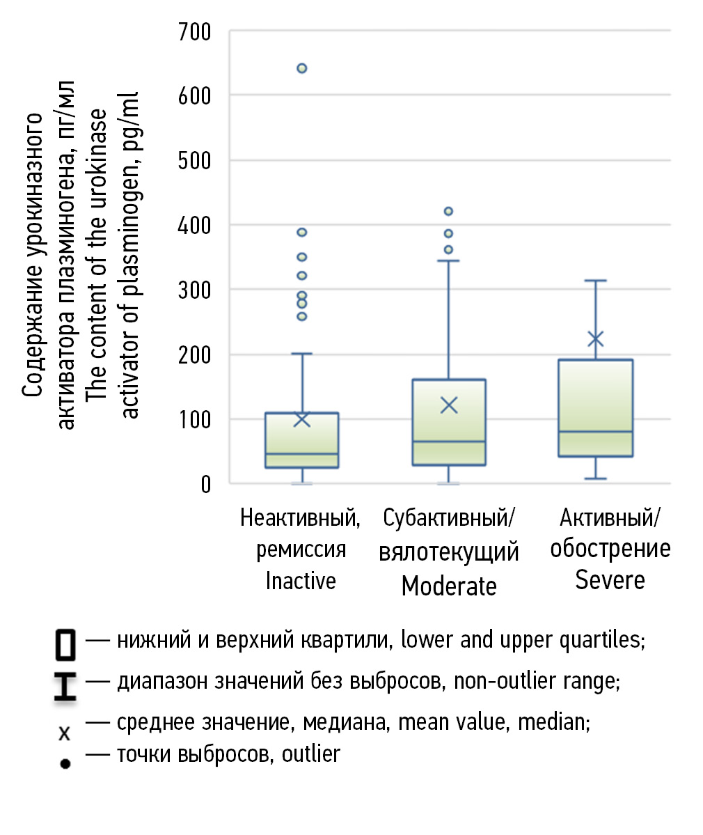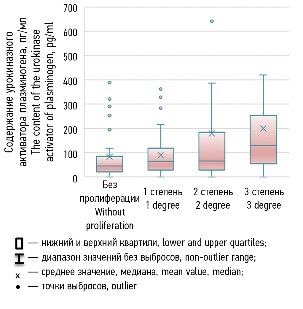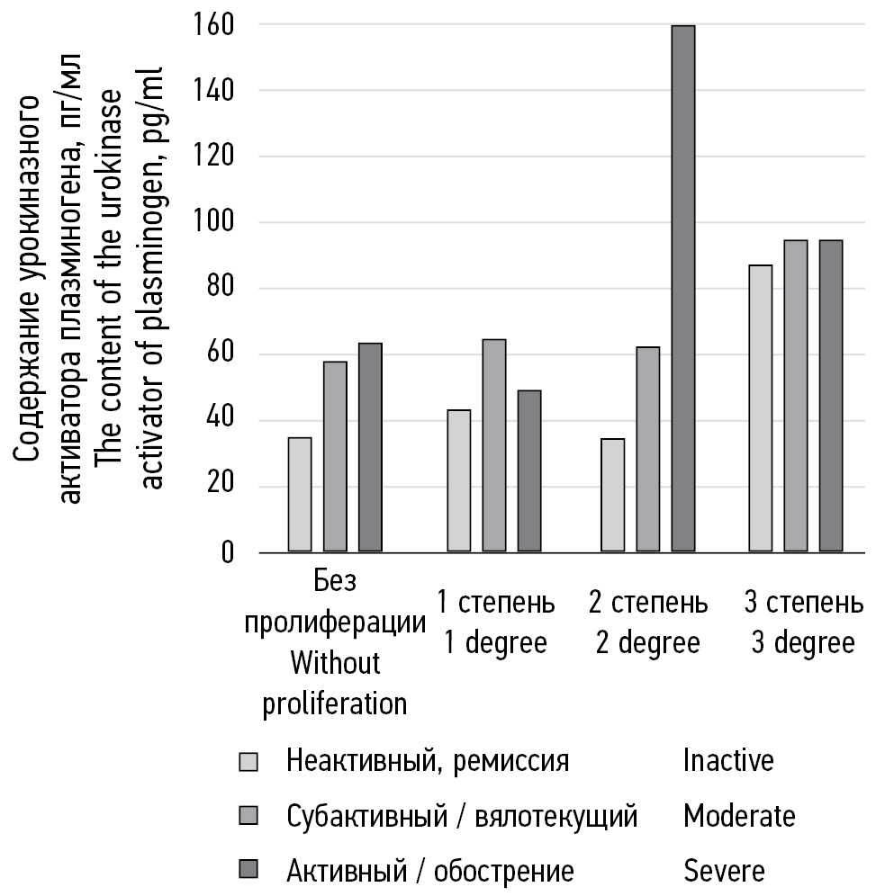 Кроме того, нами показано статистически достоверное нарастание содержания УПА в слёзной жидкости с увеличением степени пролиферативных изменений (p=0,04), что является неблагоприятным прогностическим признаком в течении увеита. Компоненты УПА-системы участвуют в пролиферации, которая может происходить как в физиологических условиях (рост и ремоделирование сосудов для поддержания гомеостаза), так и в патологических (воспаление, фиброз, фибринолиз и канцерогенез) [10–12]. Известно о способности УПА стимулировать инфильтрацию мононуклеарных фагоцитов внутри воспалённого сустава, что в итоге приводит к разрушению внеклеточного матрикса и, как следствие, разрушению хряща [24].