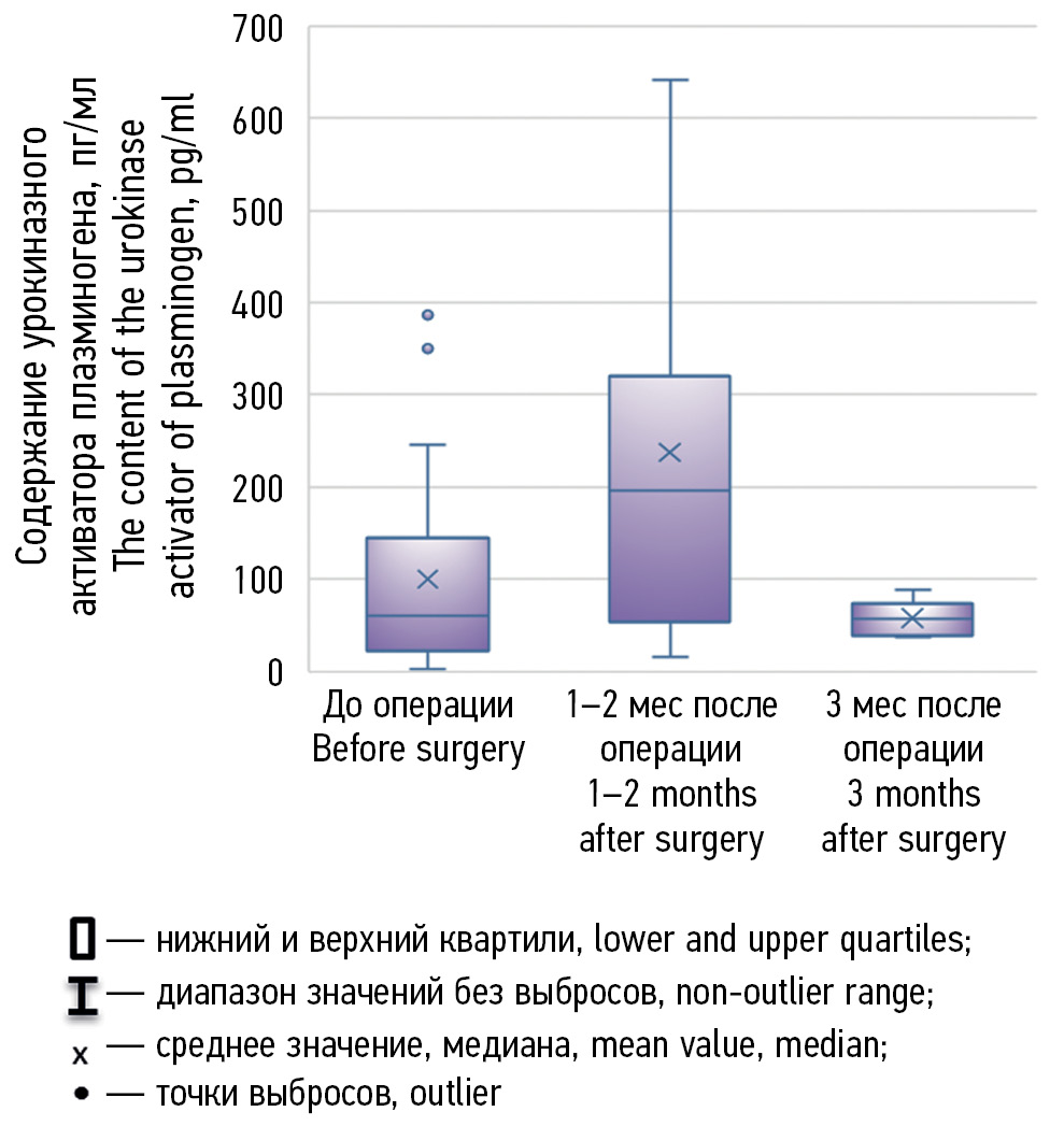 Концентрацию УПА и плазминогена определяли методом иммуноферментного анализа с помощью наборов «ELISA kit for plasminogen activator, urokinase (UPA)/ ELISA Kit for Plasminogen”, Cloud-Clone Corp, США). Содержание УПА выражали в пг/мл, плазминогена — в нг/мл.