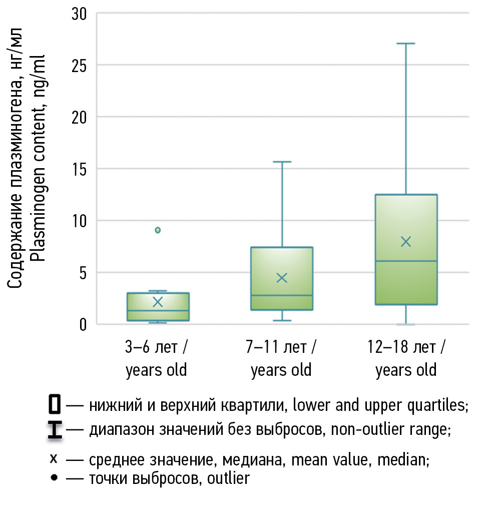 Выявлено нарастание содержания УПА и плазминогена в слёзной жидкости и плазминогена в сыворотке крови с возрастом. Известно, что содержание ПГ в плазме крови здорового новорожденного составляет около 50% от его концентрации у взрослых [25].