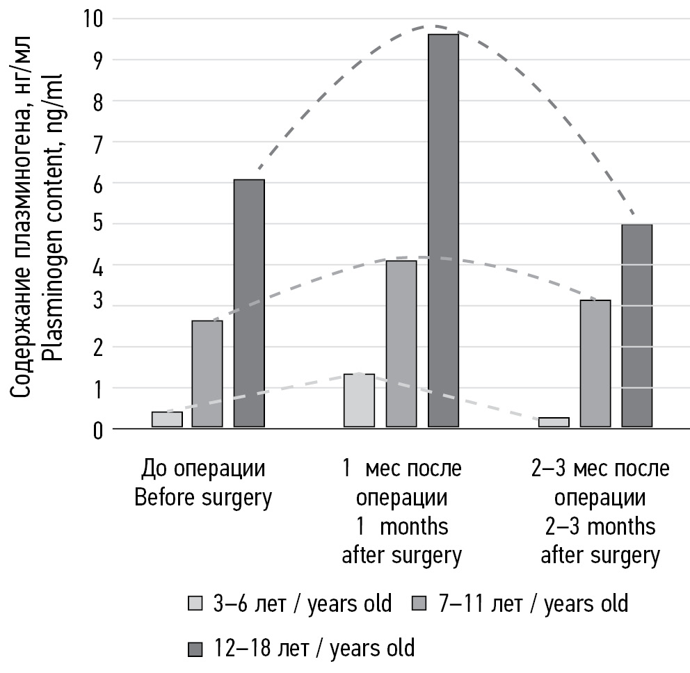 Fig. 6. Plasminogen content in tears in the preoperative and postoperative periods in children of different age groups.