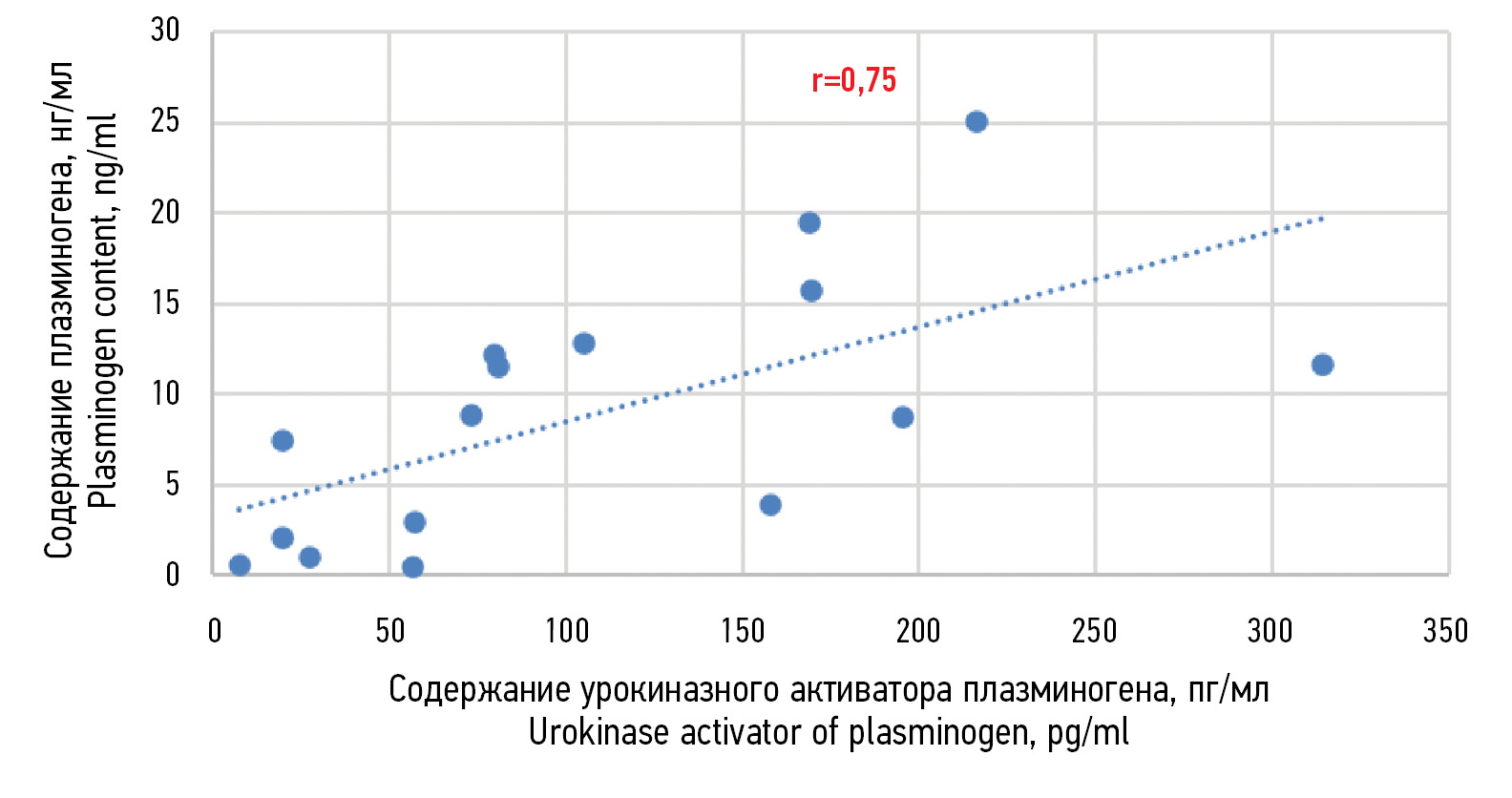 Рис. 7. Корреляционный анализ содержания урокиназного активатора плазминогена и плазминогена в слёзной жидкости (r=0,75).