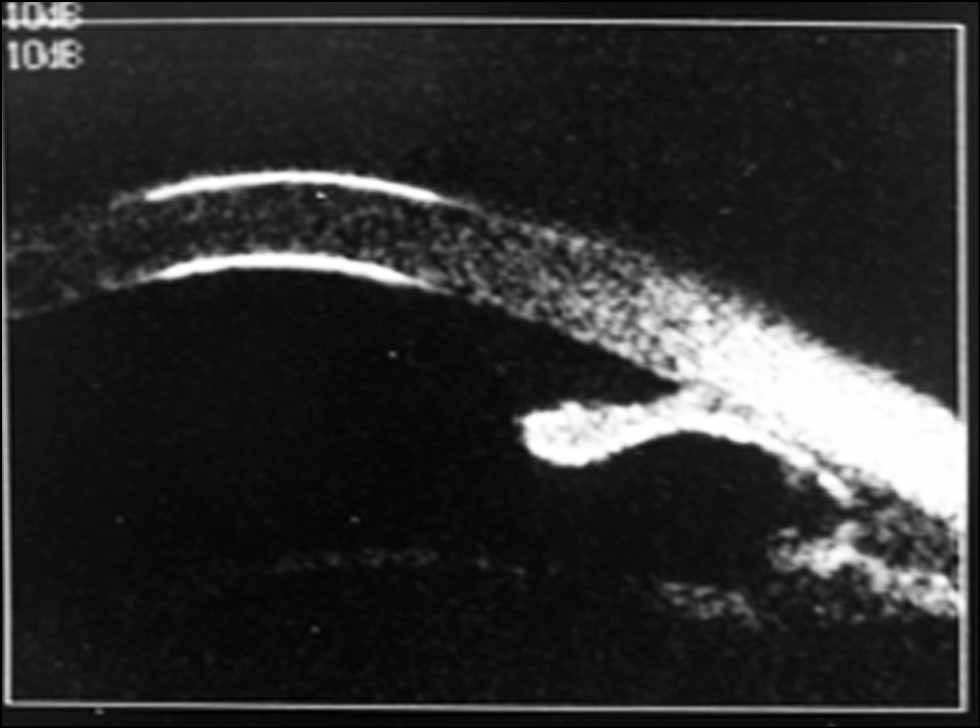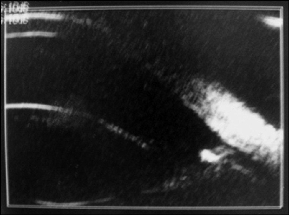 В случае невозможности выполнения гониоскопии при помутнении роговицы важным для обследования и определения тактики ведения становится применение ультразвуковой биомикроскопии (УБМ). В группе детей с полной аниридией применение УБМ позволило обнаружить в зоне расположения проекции предполагаемого радужно-роговичного угла проминирующее валикообразное образование в нескольких или во всех сегментах — рудиментарная радужка диаметром до 1–2 мм (рис. 1, 2). Во всех случаях было зафиксировано отсутствие склеральной шпоры.