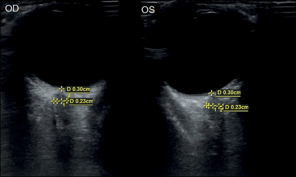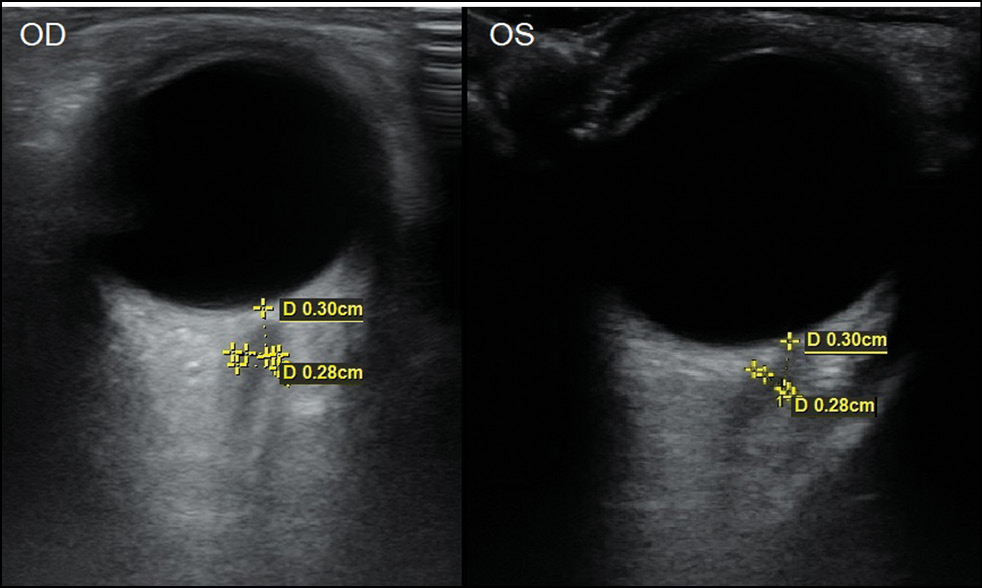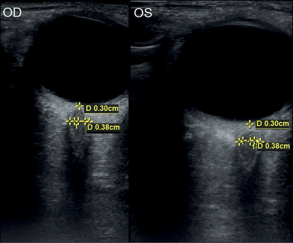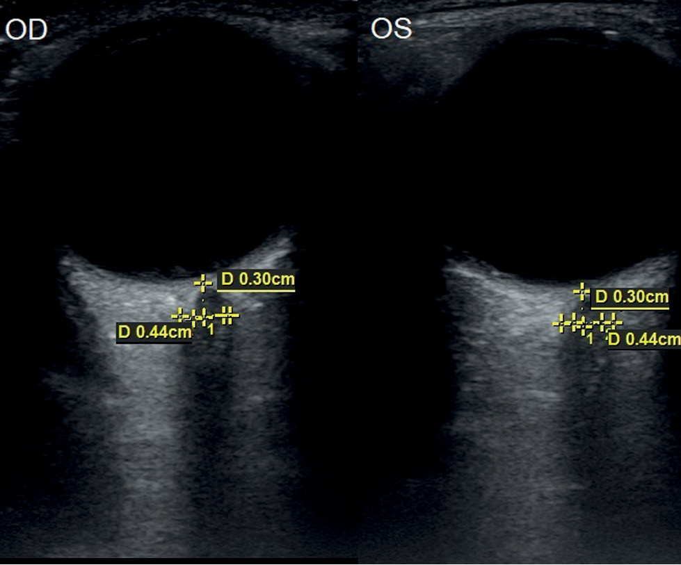 Рис. 4. Эхограмма при гипоплазии зрительного нерва обоих глаз у мальчика в возрасте 8 лет. Биометрические показатели ретробульбарного отдела зрительного нерва правого (OD) и левого (OS) глаза.