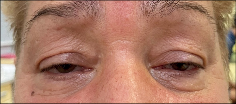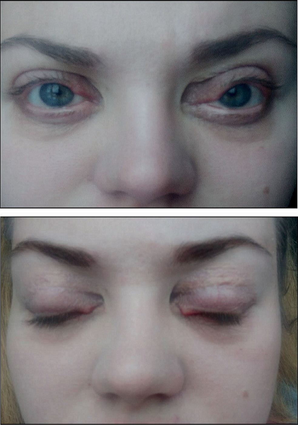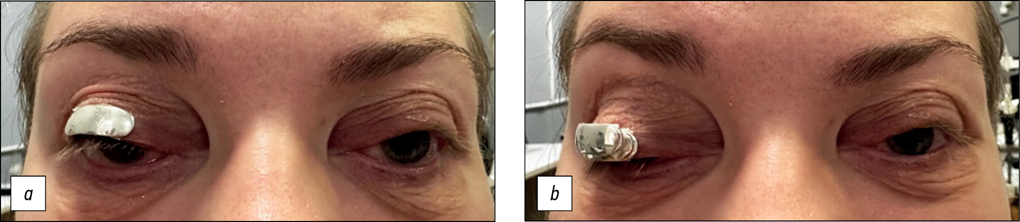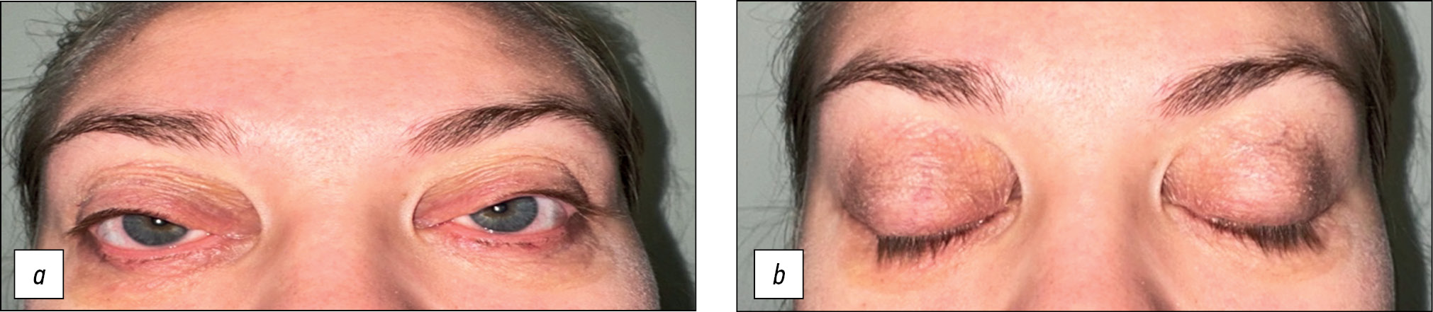 Рис. 8. Блефарохалязис вследствие отёков век: a — положение верхнего века относительно зрачка, b — изменения кожи верхнего века.