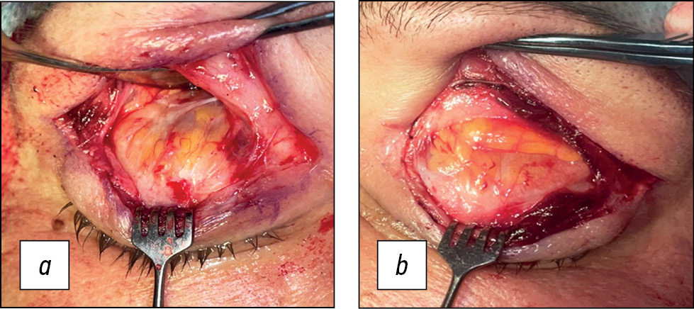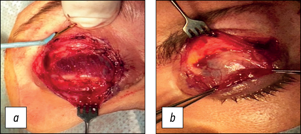 Рис. 10. Макроскопическая картина апоневроза и леватора верхнего века: a — правый глаз, b — левый глаз.