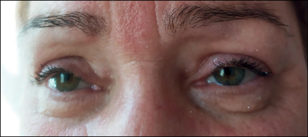 На обоих глазах (OU) верхнее веко располагалось от 2/3 в медиальной до 1/3 в латеральной части зрачка, было утолщено, гиперемировано, отделяемое отсутствовало. Мы наблюдали избыточную складчатость кожи и выраженную атонию век, рыхлость и гиперемию конъюнктивальной оболочки век, атонию слезоотводящих путей и слезостояние, присутствовали пальпаторные признаки истончения хрящевой пластинки век, выраженность и сужение слёзных точек без погружения в слёзное озеро. При надавливании на область слёзного мешка отделяемое отсутствовало. Канальцевая проба была отрицательная при наличии проходимости слёзных путей. Со стороны конъюнктивы глазного яблока отмечали конъюнктивальную инъекцию, изменения со стороны склеры и эписклеры отсутствовали. На правом и левом глазах определяли признаки эпителиопатии роговицы, справа, кроме этого с 5 ч до 6 ч, был выявлен локальный участок конъюнктивизации с 1ч до 5 ч в виде нежных краевых помутнений. На обоих глазах передняя камера имела среднюю равномерную глубину, влага передней камеры сохраняла свою прозрачность. Сохранялись структурность радужной оболочки, круглая форма зрачка, его расположение по центру, реакции на свет, прозрачность и структурность хрусталика и стекловидного тела. На глазном дне диск зрительного нерва имел бледно-розовый цвет и чёткие границы, физиологическая экскавация и расположение по центру сосудистого пучка. В макулярной зоне и на периферии признаки очаговой патологии отсутствовали.