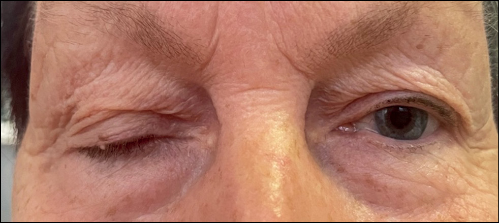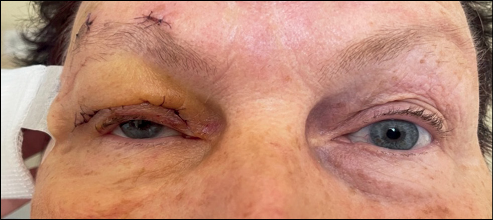 Пациентка Д., 68 лет, пенсионерка, поступила на плановое стационарное лечение в отдел пластической хирургии и глазного протезирования НМИЦ глазных болезней имени Гельмгольца с направительным диагнозом «Птоз верхнего века справа тяжёлой степени (состояние после транскутанной орбитотомии от 25.11.2021 г.» (рис. 4).