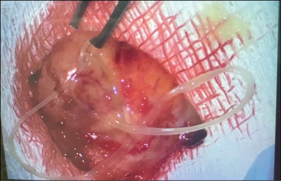 В процессе выполнения хирургического вмешательства под верхней орбитальной стенкой было выявлено плотное образование неправильной округлой формы, интимно спаянное со слёзной железой, верхней прямой мышцей, леватором верхнего века. При вскрытии плотной капсулы скальпелем выделилось слизистое светло-жёлтое отделяемое с включением гельминта — круглого червя. Материал направлен на патогистологическое исследование (рис. 5).