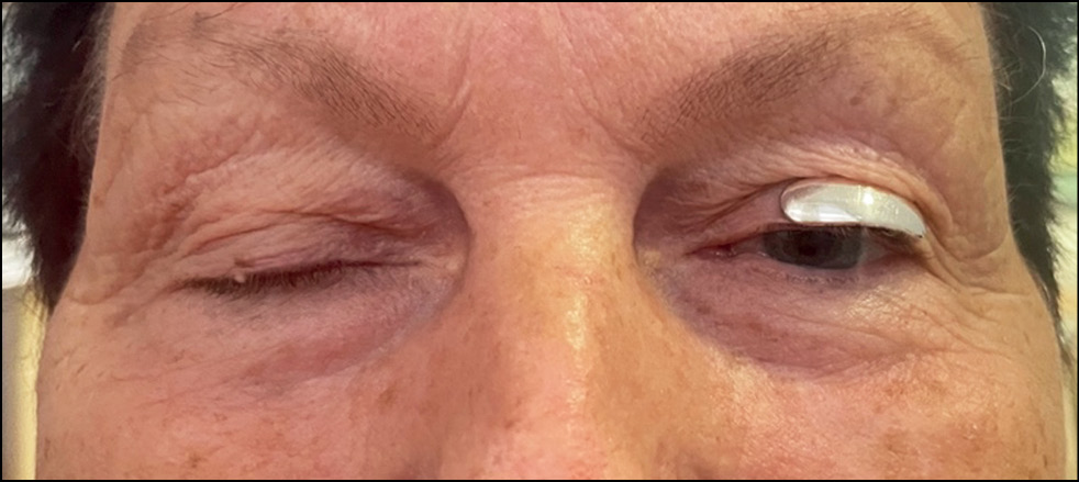 В удовлетворительном состоянии пациентка Б. была выписана под наблюдение офтальмолога по месту жительства со следующими рекомендациями: 1) ограничение физической нагрузки на 1 месяц со дня выписки; 2) приступить к выполнению служебных обязанностей не ранее, чем через 2 недели после выписки; 3) для обработки швов использовать раствор хлоргексидина биглюконата 0,05%, затем мазь глазную флоксал 3 раза в день; 4) для промывания обоих глаз выполнять закапывания между веками пиклоксидина (0,05% раствор 2 раза в день в течение 12 дней); 5) при дискомфорте применять глазной гель декспантенол; 6) швы с кожи век снять через 6–8 дней после выписки. Все препараты могли быть заменены аналогами из списка жизненно необходимых и важнейших лекарственных препаратов (ЖВНЛП). Через 6 месяцев на OD — состояние стабильное, птоза нет, на OS отмечен незначительный гипоэффект. Со слов пациентки: у нее был длительный отёк верхнего века слева (рис. 11).