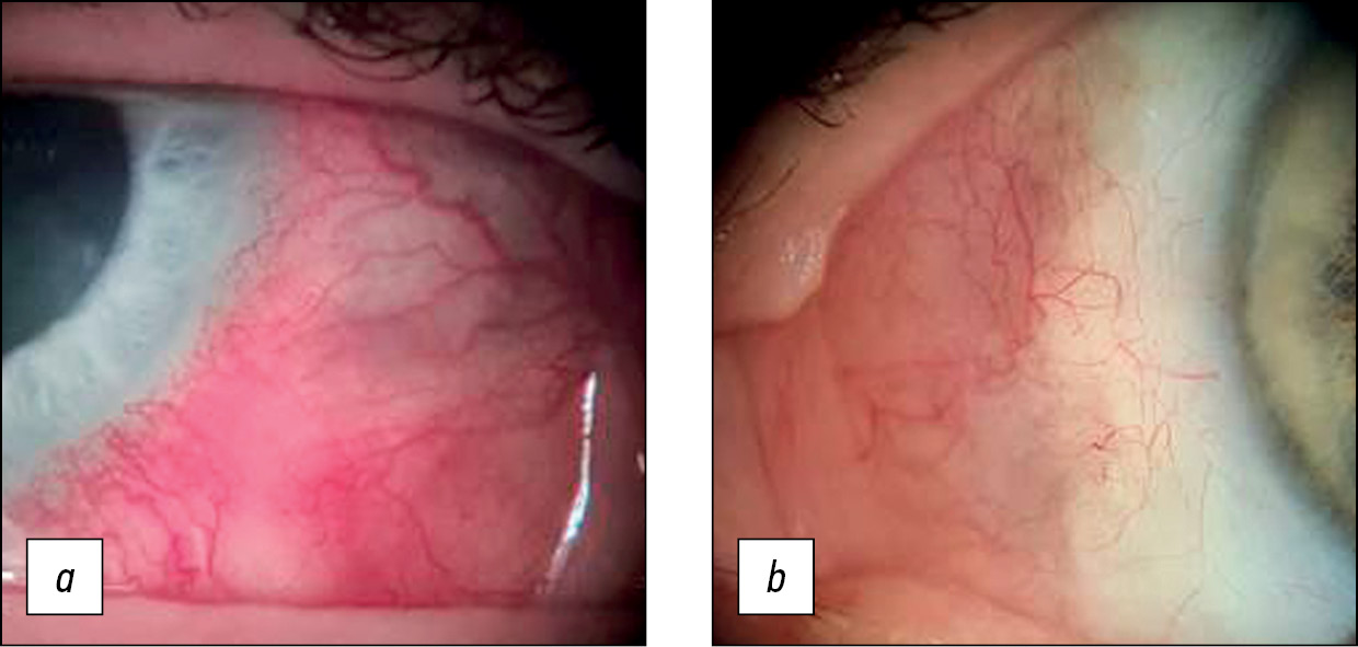 Рис. 1. Склерит передний узелковый глубокий хронический: а) локальный отёк, инфильтрация склеры и гиперемия конъюнктивы; синюшный оттенок инфильтрата, просвечивание бурой пластинки склеры и хориоидеи; b) исход склерита: истончение склеры в области резорбировавшегося инфильтрата и просвечивание бурой пластинки склеры и хориоидеи.