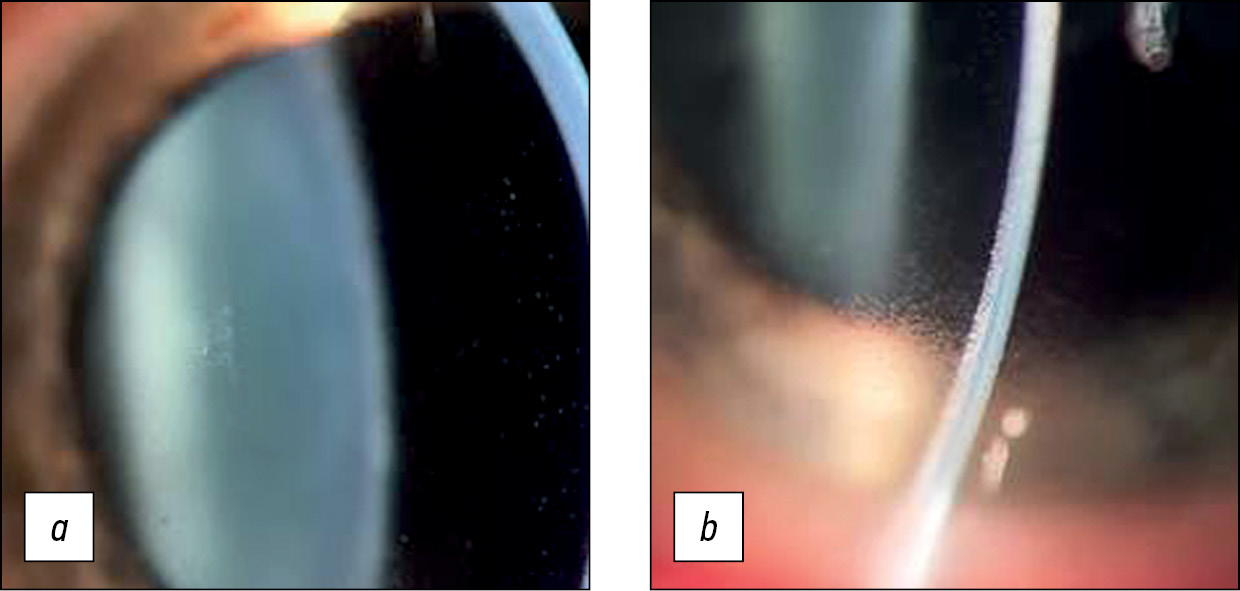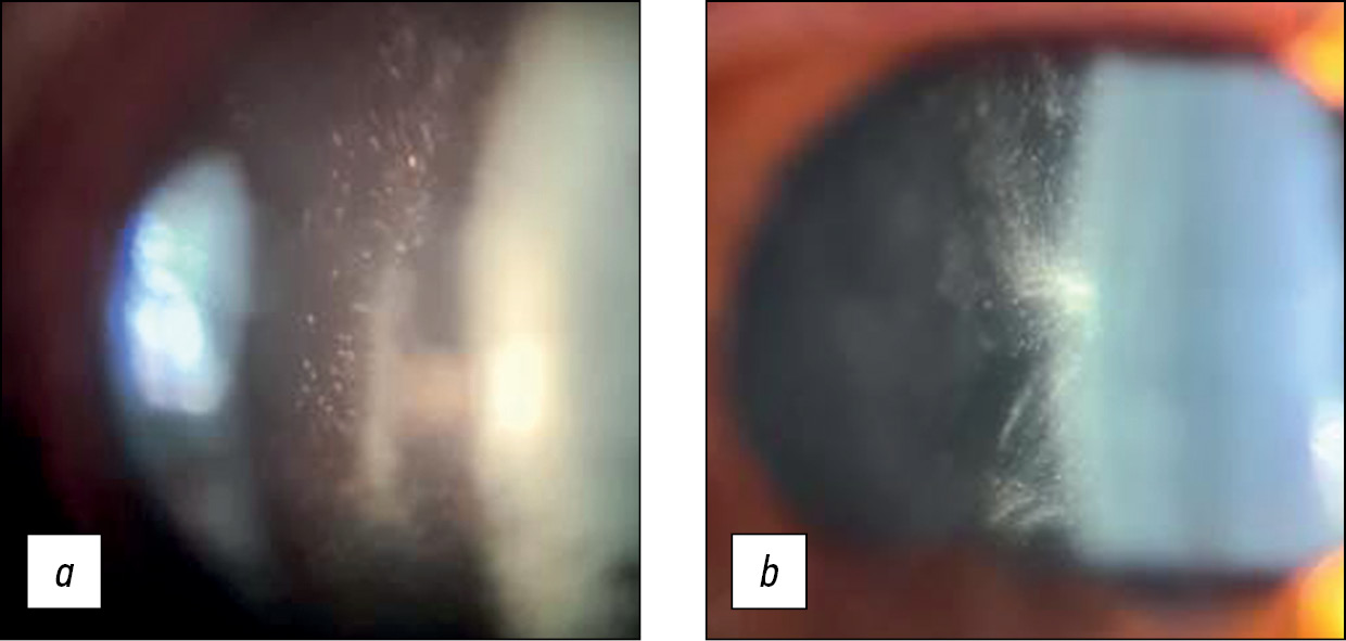 Рис. 2. Иридоциклит: а) во влаге передней камеры активные клетки 1+, b) запотелость эндотелия, множественные пылевидные преципитаты в нижней трети роговицы.