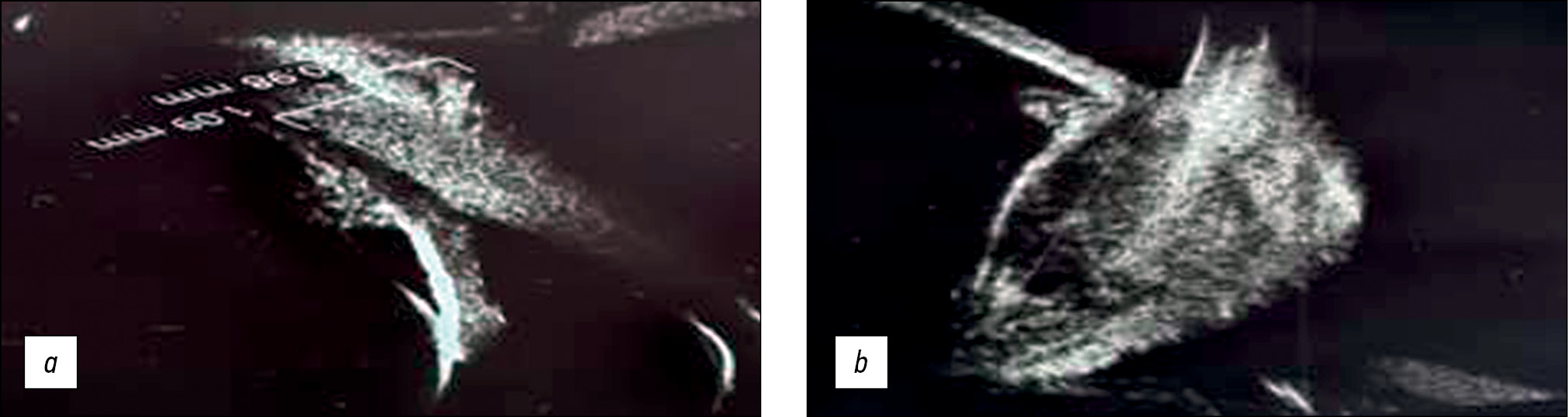 Fig. 4. Ultrasound biomicroscopy: а) local thickening of the sclera with a decrease in its echo density, b) local thickening of the sclera and ciliary body with a decrease in its echogenicity.