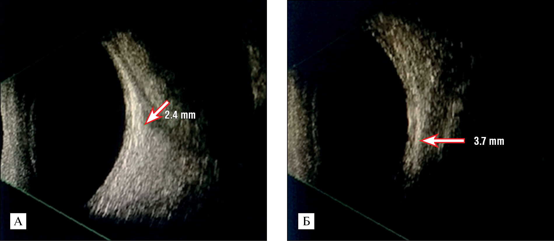 Рис. 1. Сканограммы глазодвигательных мышц (глазные мышцы визуализируются в виде трубчатых гипоэхогенных полос) А — внутренняя прямая мышца. Б — наружная прямая мышца.