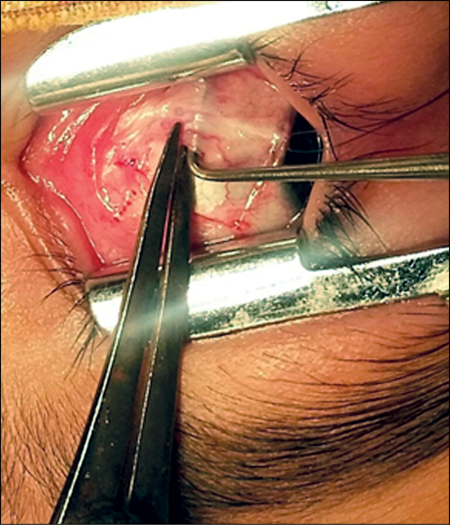 В ходе оперативного вмешательства, после выделения горизонтальных мышц с помощью циркуля Castroviejo измерялось расстояние от места прикрепления верхнего и нижнего края сухожилия до лимба и толщина брюшка без отделения теноновой сумки: при сходящемся косоглазии ВПМ, при расходящемся — НПМ (рис. 2 и 3). При этом старались сильно не тянуть мышцу.