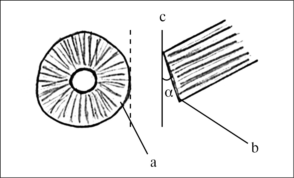 Рис. 5. Схема измерения угла ( α ) прикрепления сухожилия мышцы. а — лимб, b — линия прикрепления сухожилия мышц (соединяет верхнюю и нижнюю точки прикрепления), с — линия, проведенная, от точки ближайшего прикрепления сухожилия мышцы, параллельно лимбу, α – угол, образованный между линиями b и с.