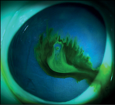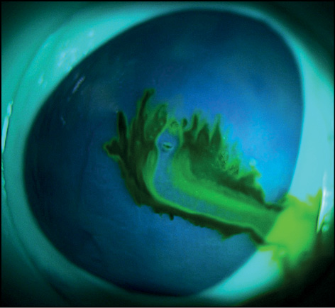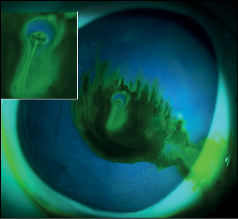Fig. 1. “Bright-green stream” phase of the Seidel test immediately after fluorescein staining.
