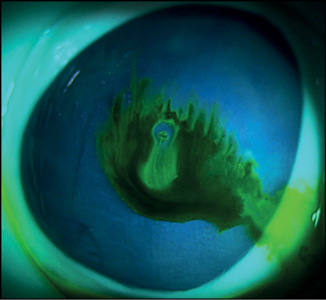 При прободном ранении роговицы вытекающая камерная влага растворяет флуоресцеин. Интенсивность флуоресценции будет напрямую зависеть от концентрации красителя [15, 16].