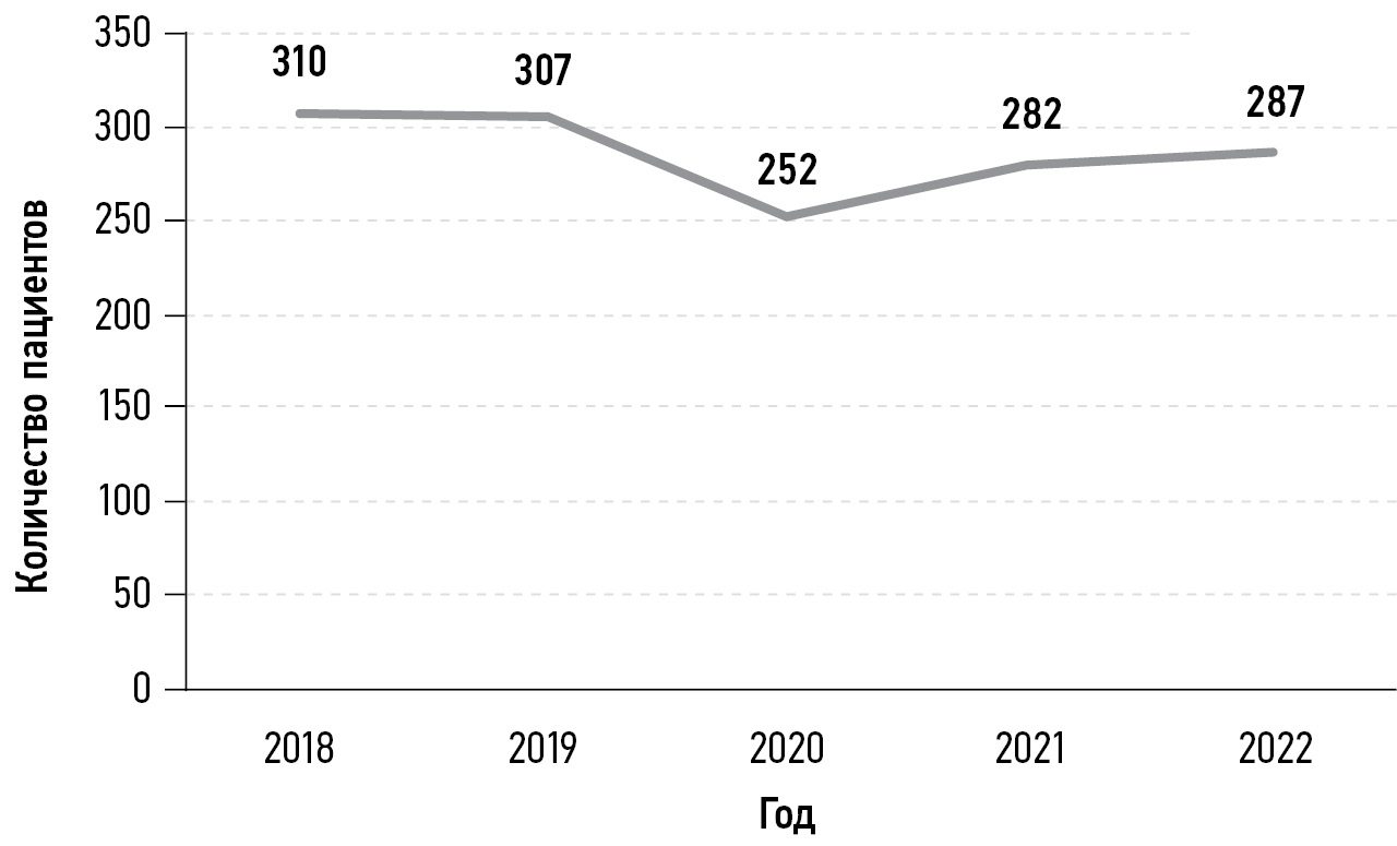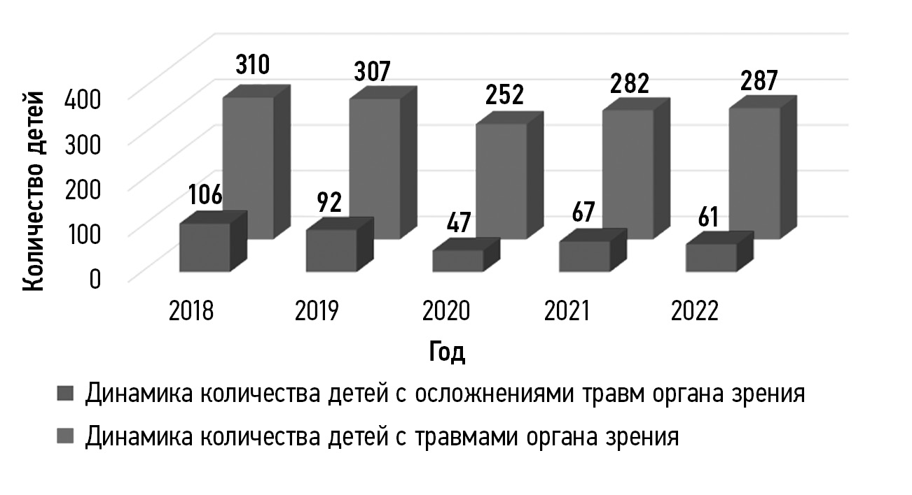 При этом частота травм органа зрения и их осложнений на протяжении пяти лет практически находилась на одном уровне: в 2018 году — 310; в 2019 — 307; в 2020 — 252; в 2021 — 282; в 2022 — 287 пациентов, соответственно (рис. 2).