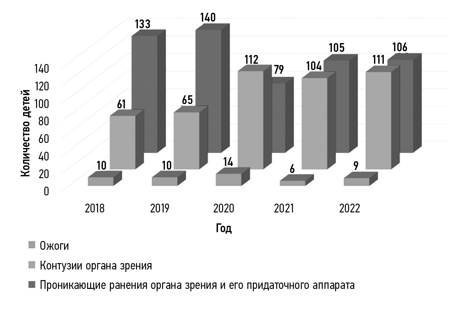 Структура травм в течение всего периода исследований была практически одинаковой. Лидирующие позиции по частоте встречаемости занимали открытые травмы глаза (ОТГ): в 2018 — 113, в 2019 — 140, в 2020 — 112, в 2021 — 104, в 2022 — 111 детей. На втором месте были ЗТГ по типу сохранности фиброзной капсулы тип «А» — контузии (ушиб) содержимого глазного яблока при сохранности его стенки. По тяжести сохранности зрительных функций 2 и 3 степеней (острота зрения варьировала в пределах от 0,3 до 0,02) частота травм распределилась таким образом: в 2018 году — 61 пациент, в 2019 — 65, в 2020 — 79, в 2021 — 105, в 2022 — 106 пациентов. На третьем месте по частоте оказались ожоги: в 2018 году — 10 человек, в 2019 — 10, в 2020 — 14, в 2022— 6, в 2022 — 9 человек. При этом в 2020 году количество закрытых травм глаза превысило число открытых травм глаза (рис. 3).