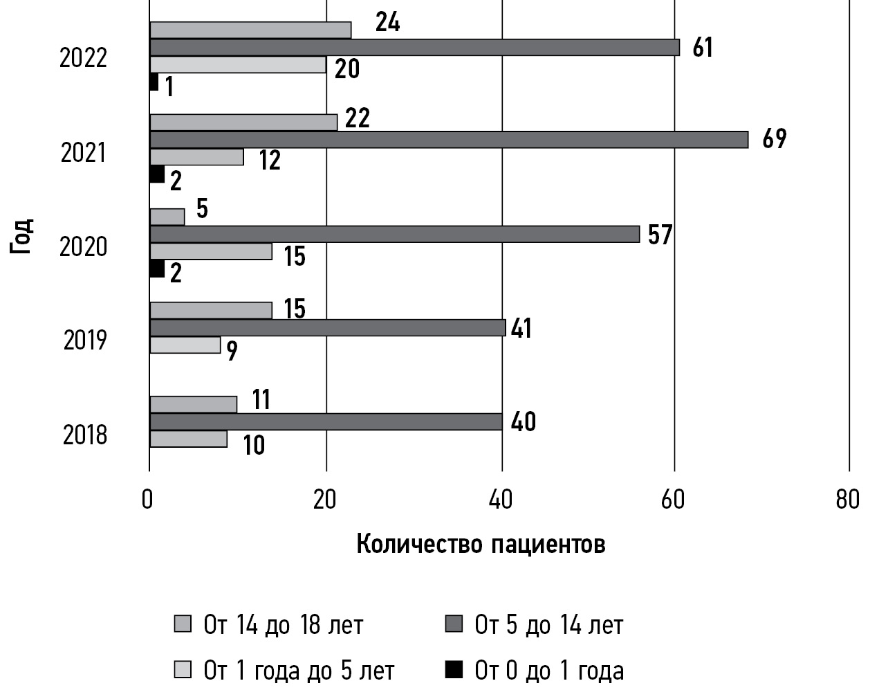 Анализ возрастного профиля закрытых травм показал широкий разброс от 0 до 18 лет. С 2020 по 2022 годы контузии встречались во всех возрастных группах, в 2018–2019 годах ЗТГ травмы не регистрировались у детей грудного возраста, хотя с 2020 по 2022 годы отмечено “омоложение”, и травмы встречались у малышей от 0 до 1 года. При этом количество пациентов с ЗТГ в возрастной категории от 5 до 14 лет имело устойчивую тенденцию к росту в течении всех пяти лети и составляло 64,42% от общего количества закрытых травм, наименьшее количество пациентов было в возрасте от 0 до 1 года (рис.4).