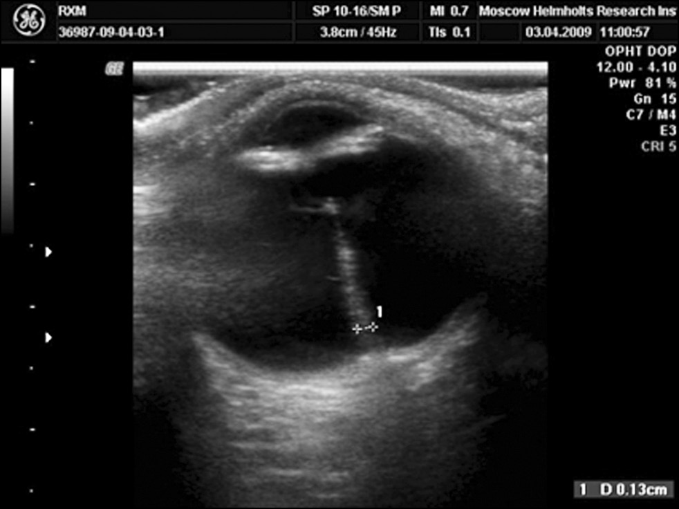 Group 1 (32 eyes) included children with the least pronounced manifestations of PHPV. The anteroposterior axis (APA) of the eye corresponded to the age norm or was slightly reduced by 0.5–0.8 mm (21 eyes). Ultrasound examination (B-scan and Dopplerography) showed a thin strand up to 1.0 mm in diameter in the depleted hyaloid artery, running from the OND to the posterior capsule of the lens or breaking off at different distances from the OND (Fig. 1).