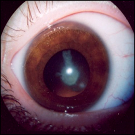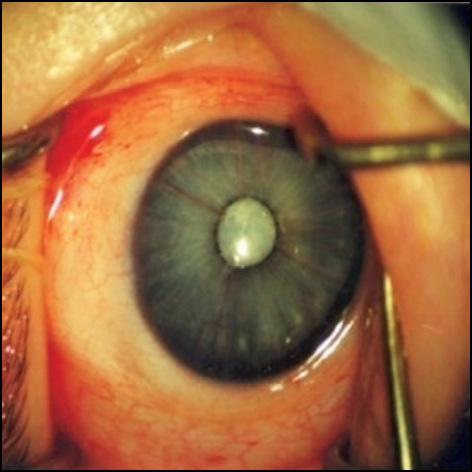 Fig. 3. Anterior variant of the primary persistent hyperplastic vitreous syndrome. The full form of congenital cataract, newly formed vessels in the iris.