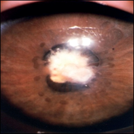 Fig. 4. Anterior variant of рrimary persistent hyperplastic vitreous syndrome. The semi-absorbed form of congenital cataract, persistent vascular bag of the lens, iridocapsular fusion.