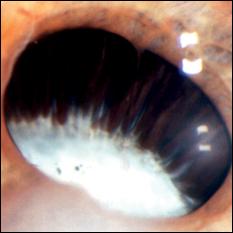 Group 2 (15 eyes) consisted of children with more pronounced manifestations of PHPV characterized by an uneven depth of the anterior chamber of the eye and presence of dilated vessels in the iris, often passing through a retrolental fibrous membrane occupying 1/8 to 1/2 of the area of the posterior capsule with elongated ciliary processes fixed to it at various lengths (Fig. 3).