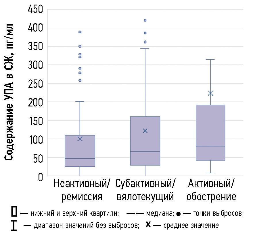 Анализ результатов показал, что активность и содержание протеолитических ферментов и их ингибиторов в сыворотке крови у детей с увеитом широко варьировали и не были связаны с активностью воспаления, поэтому дальнейший анализ представлен только для слёзной жидкости и влаги передней камеры (табл. 2).