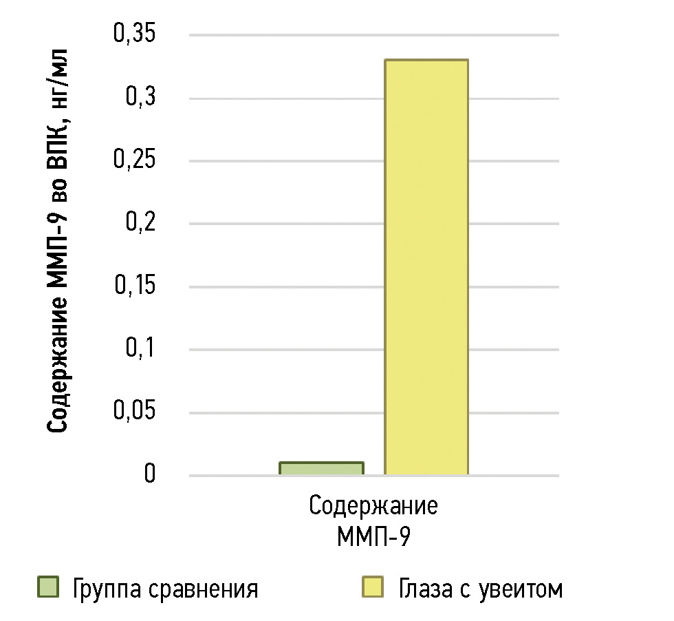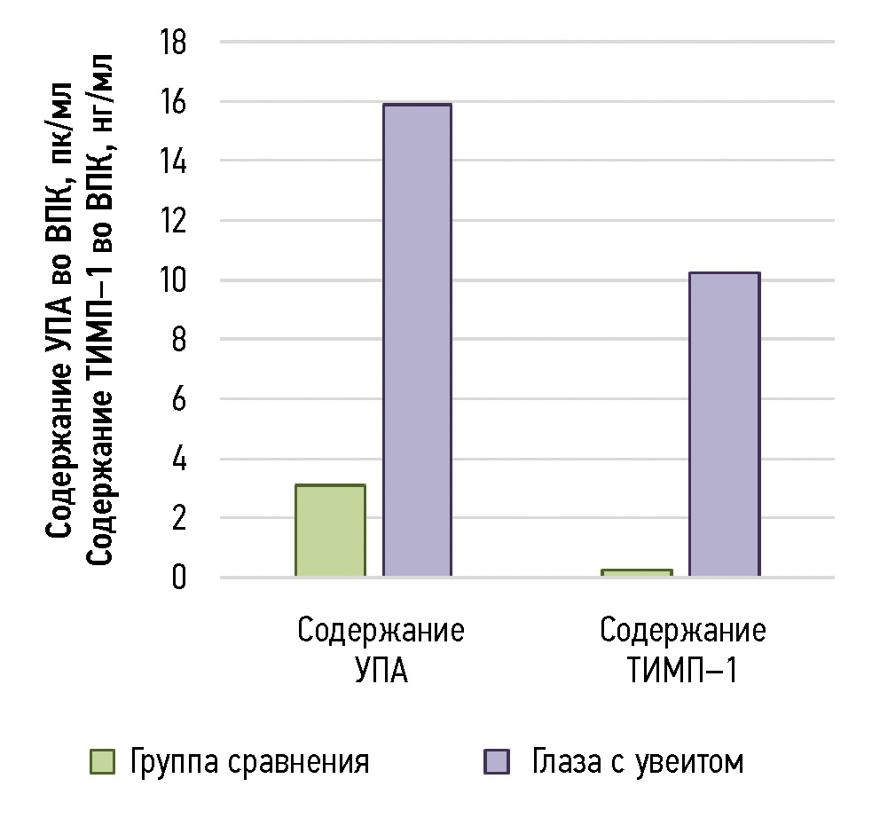 Установлено, что активный воспалительный процесс сопровождается активацией протеолитических ферментов и их ингибиторов, что проявляется увеличением содержания УПА в слёзной жидкости, УПА, ММП-9 и ТИМП-1 во влаге передней камеры, а определение УПА в слёзной жидкости является одним из объективных критериев определения активности увеита.