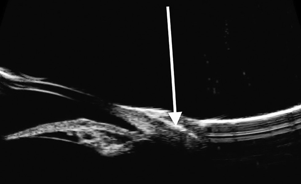 Fig. 5. Ultrasound biomicroscopy on Day 45 post-surgery. The arrow marks the surgery area (1).