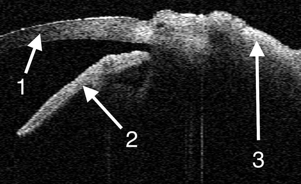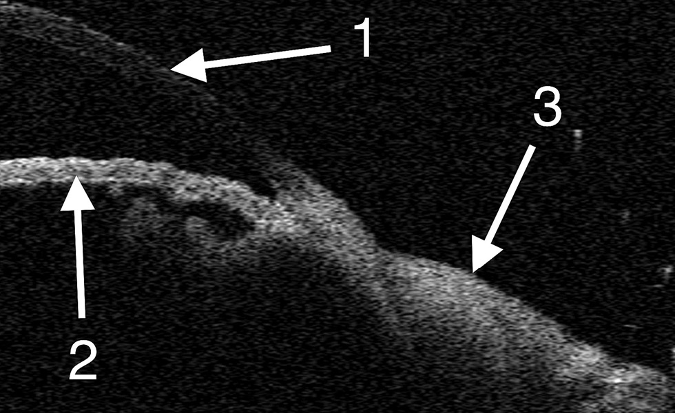 Fig. 4. Optical coherence tomography on Day 21 post-surgery: 1, cornea; 2, iris; 3, conjunctiva in the area of surgery.